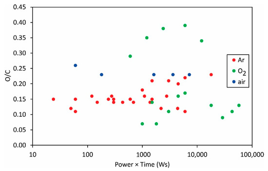 The O/C ratio versus the product of the reported discharge power and treatment time.