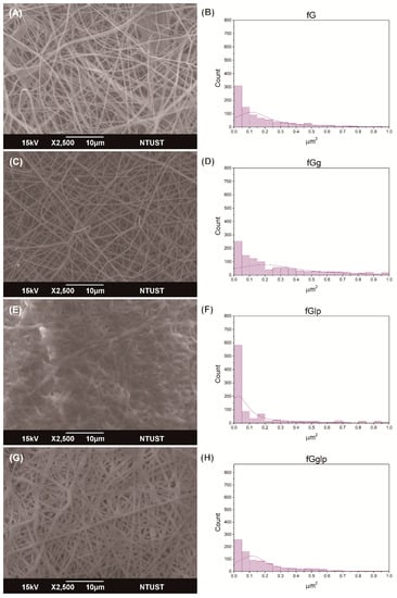 The SEM images of indicative nonwoven mat. (A,B) fG; (C,D) fGg; (E,F) fGlp; (G,H) fGglp. (fG: fish gelatin, g: gallic acid, lp: liquid paraffin).