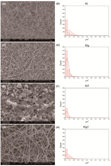 The SEM images of indicative nonwoven mat. (A,B) fG; (C,D) fGg; (E,F) fGT; (G,H) fGgT. (fG: fish gelatin, g: gallic acid, T: Tween 80).