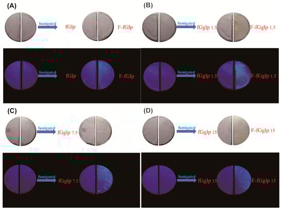 The fluorescence emission pictures of fGglp indicative nonwoven mat system with different concentrations of liquid paraffin: (A) 10 μL, (B) 15 μL, (C) 75 μL, and (D) 150 μL. (fG: fish gelatin, g: gallic acid, lp: liquid paraffin, F: fumigated).