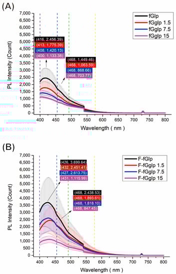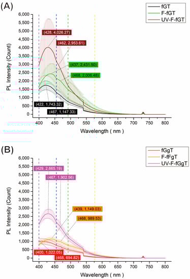 The fluorescence emission spectrum of (A) indicative nonwoven mat and (B) gallic acid-containing indicative nonwoven mat. (fG: fish gelatin, g: gallic acid, T: Tween 80, F: fumigated, UV: 365 nm).