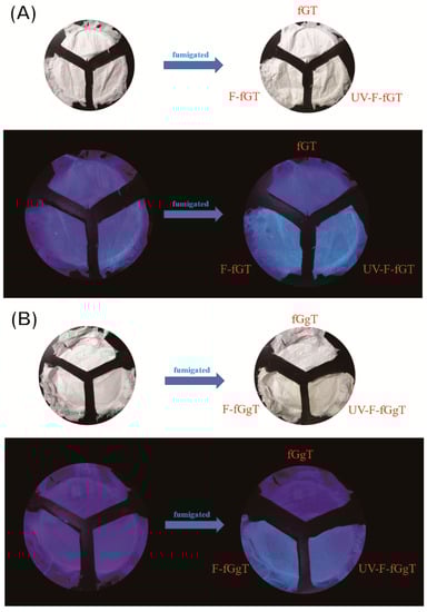 The fluorescence emission pictures of (A) indicative nonwoven mat and (B) gallic acid-containing indicative nonwoven mat. (fG: fish gelatin, g: gallic acid, T: Tween 80, F: fumigated, UV: 365 nm).