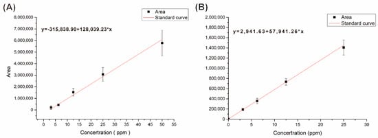 The standard curves that were plotted depending on integral area and concentration (ppm). (A) Gallic acid, (B) nicotine.