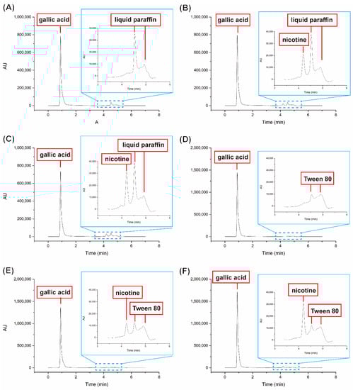 The HPLC–UV spectrum of (A) fGglp, (B) F–fGglp, (C) UV–F–fGglp, (D) fGgT, (E) F–fGgT, (F) UV–F–fGgT. (fG: fish gelatin, g: gallic acid, lp: liquid paraffin, T: Tween 80, F: fumigated, UV: 365 nm).