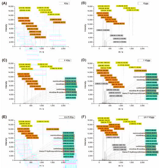 HPLC–UV was used to determine the efficiency of liquid paraffin and Tween 80 in the nonwoven mat for enhancing nicotine capture. The amount of nicotine and gallic acid was determined using the standard curves that were established using the integration area of the UV peak absorption versus concentration (ppm; Figure 7). As can be seen in the figure, two equations were derived from the standard curves for gallic acid and nicotine, respectively. As the components of our nonwoven mats included gallic acid, Tween 80, liquid paraffin, and the adsorbate (i.e., nicotine), we detected the releases of those components in the fGglp (fish gelatin/gallic acid/liquid paraffin) and fGgT (fish gelatin/gallic acid/Tween 80) nonwoven mats. In Figure 8, the analyte peak elutions at 0.89, 4.20, and 4.53 min in the HPLC–UV spectra were attributed to gallic acid, nicotine, and liquid paraffin (or Tween 80), respectively. For the fresh nonwoven mats (control group, Figure 8A,D), subtle peaks were observed at 4.20 min, suggesting that these peaks were attributed to the adsorbate nicotine after the nonwoven mat had been used. The peak of nicotine could be separated and observed at 4.20 min with the UV absorption detection at 259 nm, as analyzed using the HPLC–UV system. The peak areas acquired from various samples were calculated (using the standard curves and linear equation) as 152.25 ± 6.59 µg (F–fGglp), 180.10 ± 16.08 µg (UV–F–fGglp), 101.15 ± 16.15 µg (F–fGgT), and 162.91 ± 17.23 µg (UV–F–fGgT; Table S3). Table S3 and Figure 8B,C,E,F clearly show that the content of adsorbed nicotine could be increased by 18–61% when the UV light was irradiated on the nonwoven mats during the sidestream smoke fumigation period. The peaks of the liquid paraffin and Tween 80 groups were notably present at 4.53 min. When Figure 8A,D was compared with the others, the peaks at 4.53 min in Figure 8B,C,E,F were stronger than Figure 8A,D as presented in Table S3. These results could be determined by the correlation of nicotine with liquid paraffin (or Tween 80). Noteworthily, because liquid paraffin and Tween 80 were not dissolvable by mobile phase methanol, only the nicotine could be dissolved, which suggested that part of the liquid paraffin and Tween 80 could be dissolved and extracted when interacting with nicotine. To further verify this hypothesis, the extraction liquid from the nonwoven mat was analyzed using both HPLC–UV and HPLC–MS data. The results of HPLC–MS provided the necessary information to precisely understand the varieties of nicotine derivatives that were captured or photodegraded from the nicotine in the sidestream cigarette smoke.