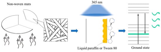 The fluorescence emission spectra results could be used to evidence the process of photoindication. The nicotine-dissolving polymer materials (i.e., liquid paraffin and Tween 80) were the key components in the nonwoven mat, responsible for adsorbing the nicotine for fluorescence emission. To observe the change in fluorescence property between nicotine, nicotine-dissolving polymer materials, and 365 nm UV light, the equal parts of nonwoven mats were recorded to measure the disparity in 365 nm UV. The equal parts of nonwoven mats could emit fluorescence after the fumigation step. Then, the nonwoven mats were used to detect the distribution of emission wavelength and the disparity of intensity by fluorescence spectrophotometer, as shown in Figure 3, Figure 4, Figure 5 and Figure 6. In Figure 4, the quantitative emission spectra acquired from the fGglp (fish gelatin/gallic acid/liquid paraffin) nonwoven mat with different proportions of added paraffin proved the fluorescence intensity and wavelength before and after the sidestream smoke was absorbed. The cigarette smoke caused a purple emission light redshift at approximately 10–30 nm and simultaneously enhanced the intensity of the blue emission light at 468 nm. Figure 6 indicates the emission spectrum acquired from the fGgT (fish gelatin/gallic acid/Tween 80) nonwoven mat system, which was irradiated by a UV light (365 nm, UV absorption maximum wavelength of gallic acid) and simultaneously adsorbed the sidestream smoke to confirm the effect of UV irradiation on the activation of photoindication and the photodegradation property. The purple emission peak (400 nm) exhibited redshift at approximately 29 nm before and after UV exposure. Notably, the fluorescence did not disappear after the fumigation; conversely, the emission peak intensity at 429 and 467 nm was considerably enhanced (Figure 6B). This result reveals that the nicotine-dissolving polymer (i.e., Tween 80) played a key role in dissolving the sidestream-smoke nicotine, possibly performing a similar function to that of the ellagic acid, which altered the conformation of the chemical structure after reacting with some small molecules. When the nonwoven mat was irradiated by 365-nm UV light and adsorbed the sidestream smoke, the fluorescence emission was activated and markedly greater (see Figure 6B, pink curve) than that of the nonexposed nonwoven mat (see Figure 6B, orange curve).