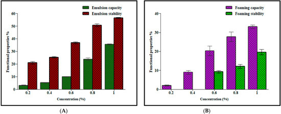 Figure 2. Comparison between emulsion capacity (%), emulsion stability (%) (A), foaming capacity (%) and foaming stability (%) (B) of M. parviflora mucilage obtained from the leaves (MLM) at different concentrations.