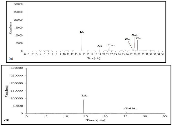 Figure 6. GC/MS chromatograms of neutral (A), and acidic (B) polysaccharides in M. parviflora mucilage, obtained from the leaves (MLM).