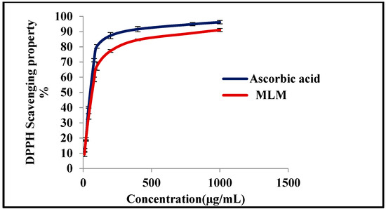 Figure 7. In vitro antioxidant activity assessment of MLM and compared to ascorbic acid using the 1,1-diphenyl-2-picrylhydrazyl (DPPH*) radical scavenging capacity assay.