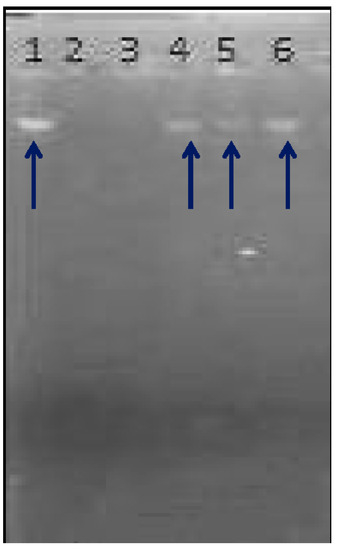 Figure 8. DNA damage protective effect of MLM. Lane 1: 4 µL DNA + 16 µL DW; Lane 2: 3 µL FR + 17 µL DW; Lane 3: 4 µL DNA + 3 µL FR + 13 µL DW; Lane 4: 4 µL DNA + 4 µL MLM (50 µg/mL) +3 µL FR + 9 µL DW; Lane 5: 4 µL DNA + 4 µL MLM (100 µg/mL) + 3 µL FR + 9 µL DW; Lane 6: 4 µL DNA + 4 µL MLM (200 µg/mL) + 3 µL FR+ 9 µL DW.