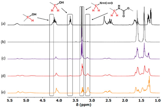 1H-NMR Spectra for OligoPHB-diols and the different PUPs. From top to bottom: (a) oligoPHB-diol, (b) HDI, (c) PUP6-1, (d) PUP4-1 and (e) PUP2-1. Main functions and hydrogens are depicted on top of the figure, and corresponding changes in the spectra are circled.