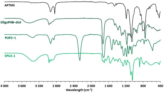 For the xerogels multistep synthesis, the structure of the different intermediate systems oligoPHB-diol, PUP and SPU (Scheme 2) were analyzed by ATR-FTIR. Figure 2 shows the spectrum of APTMS, the oligoPHB-diol, PUP and SPU for the synthesis of SPU2-1. In the first step of reaction from oligoPHB-diol to PUP, the disappearance of the O-H stretching vibration from the oligoPHB-diol reaction with HDI was shown at 3400 cm−1, as well as the appearance of characteristic NCO-terminated PU bands in PUP at 3329, 2260, 1700 and 1515 cm−1. They were attributed to the urethane stretching vibrations from N-H, N=C=O from terminal functions and C=O bonds, and urethane N-H bending vibrations, respectively.
