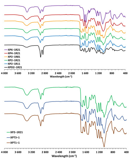 The chemical structure of the four PUPs was confirmed by 1H-NMR. Spectra are presented in Figure 1 for the HDI-based PUP and in Supporting Information (Figure SI.1) for PUPD2-1 compared to neat DDI and oligoPHB-diol. Protons from oligoPHB-diol hydroxyl end functions (δ = 3.67 and 4.19 ppm) disappeared after reaction with -NCO groups to form urethane bonds. Chemical shift at δ = 3.14 ppm was assigned to -CH2-NH-CO-O protons from HDI or DDI, and at δ = 3.29 ppm to protons adjacent to the terminal -NCO groups. Finally, signals in the region δ = 1.57–1.77 ppm correspond to the superimposition of -CH2- protons from oligoPHB-diol, HDI and DDI chains. From PUP2-1 to PUP6-1, the peak at chemical shift δ = 3.29 ppm had increasing intensity due to the presence of HDI free monomers in higher amounts in PUP4-1 and PUP6-1, and thus of terminal -NCO. On the contrary, a small peak was observed when using DDI, mainly in comparison to the high intensity of the -CH2- protons peak region (δ = 1.57–1.77 ppm) coming from its aliphatic pending chains (Scheme 2).