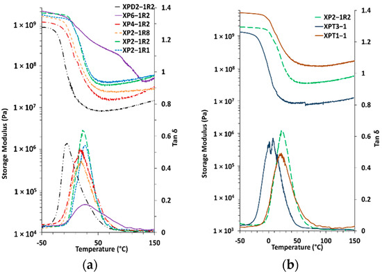 DMA spectra of the organic–inorganic networks. Storage modulus and tan evolutions are given in the top and the bottom of the spectra, respectively. (a) corresponds to Series 1, 2, 3 and (b) to Series 4.