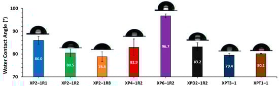 Figure 7 exhibits the measured sessile WCA of the xerogels, with the average values and representative pictures of the drops shapes. Most xerogels displayed slightly hydrophilic behavior with contact angles < 90°, except XP6-1R2, which was slightly hydrophobic (96.7°). As expected, increasing the crosslinked siloxane network content (Table 2) leads to a significant increase of the apparent contact angle due to a hydrophobic Si-O-Si network, as already described in previous studies [23,43]. Contact angles indeed increased from 78.8 to 86.0° with decreasing Rw, and from 78.8 up to 96.7° for XP2-1R2 and XP6-1R2 in Series 1, respectively. A slight but not significant increase in contact angle was observed between the HDI- and the DDI-based xerogels due to the intrinsic higher hydrophobicity of DDI and its long aliphatic grafted chains. Finally, one could have expected an increase of contact angle with the gradual substitution of SPU polymer by TEOS, hence between XP2-1R2, XPT3-1 and XPT1-1. However, the measured angles were similar, at around 80°.