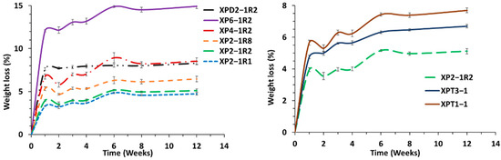 Evolution of the xerogels degradations (weight loss in %) in PBS at 37 °C for 12 weeks.