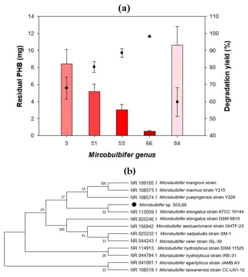 PHB-degrading bacteria were isolated from soil samples collected from Korean seashores. A considerable number of strains were identified as belonging to the Microbulbifer genus and showed decent biodegradability among other isolates (Table 1). Five isolates, Microbulbifer sp. SOL03 (95.81% 16S rRNA with similarity to Microbulbifer taiwanensis), Microbulbifer sp. SOL51 (95.15% 16S rRNA with similarity to Microbulbifer aesturariivivens), Microbulbifer sp. SOL55 (96.94% 16S rRNA with similarity to Microbulbifer salipaludis), Microbulbifer sp. SOL66 (94.18% 16S rRNA with similarity to Microbulbifer hydrolyticus), and Microbulbifer sp. SOL84 (97.01% 16S rRNA with similarity to Microbulbifer elongatus) formed distinct clear zones on the PHB emulsified plate only for a few days. Subsequently, they were cultured in a liquid MB with 20 mg of PHB film for 4 d at 37 °C to identify their biodegradability using a liquid-based method (Figure 1a). The residual PHB (mg) was measured by GC, and the degradation yield (%) was calculated relative to the original amount of PHB (mg).