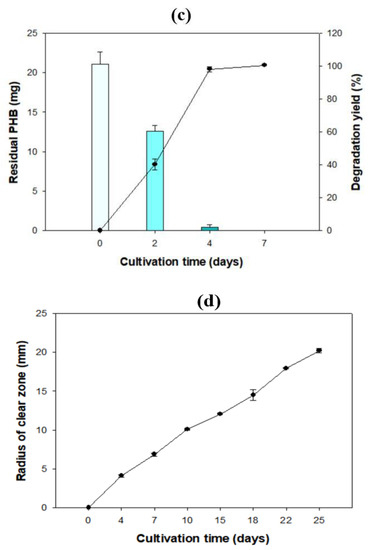 Scanning electron microscopy (SEM) was performed to observe the changes on the surface of the PHB film after degradation. For SEM analysis, the residual PHB films on each day were collected by centrifugation and fixed with 2% buffered glutaraldehyde overnight at 4 °C. Glutaraldehyde was decanted after centrifugation, and the samples were washed three times with phosphate buffer to remove residual glutaraldehyde. The samples were then dehydrated using a gradually increasing ethanol concentration (50%, 70%, 95%, and 100%). Finally, different ratios of ethanol and hexamethyldisilazane (HMDS; 2:1, 1:1, 1:2 v/v) were used for chemical drying; 100% HMDS was used in the final step, and the mixtures of HMDS and samples were mounted on specimen stubs. The HMDS was evaporated overnight in a fume hood. The samples were then coated with gold dust at 5 mA for 120 s. Back-scattered electron images were obtained using a scanning electron microscope (TM4000Plus; Hitachi, Ltd., Tokyo, Japan) at an accelerating voltage of 5 kV [].