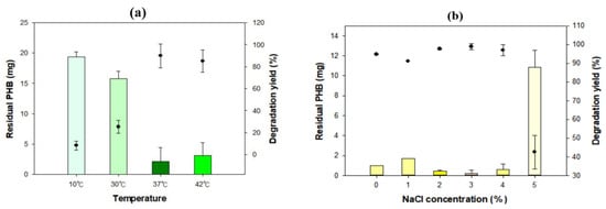 To maximize the degradation activity of Microbulbifer sp. SOL66, the optimal conditions with respect to temperature, salt concentration, and carbon and nitrogen source addition were established. Microbulbifer sp. SOL66 cells were cultured with the PHB films at various temperatures ranging from 10 °C to 42 °C for 4 d, and the residual PHB (mg) was measured using GC (Figure 2a). It was observed that the PHB film did not grow or degrade at 10 °C, leaving the film almost intact. The degradation yield gradually increased as the cultivation temperature increased to 37 °C, representing the highest degradation yield of approximately 90%. However, a decreased degradation yield was shown at 42 °C, indicating that the optimal temperature for Microbulbifer sp. SOL66 to degrade PHB film was 37 °C. This might be related to the optimal temperature for its growth, which is also 37 °C []. In addition to the temperature, the optimal salt concentration for biodegradation was observed (Figure 2b). Additional NaCl was added to adjust the salt concentration to 5%. The best degradation yield was shown when 3% NaCl was added, decomposing almost the entire PHB film. However, the degradation yield considerably decreased when more than 5% of NaCl was added, potentially because the high salt concentration burdened the cell and negatively affected the degradation potential.