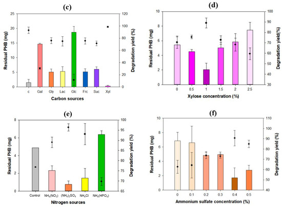 In addition, different types of carbon and nitrogen sources were added to observe their effect on biodegradation and to improve the degradation yield of the cell. For the carbon sources, galactose, glycerol, lactose, glucose, fructose, sucrose, and xylose were added at 1% (w/v) concentration. The residual PHB films were compared to the control group cultured without carbon sources (Figure 2c). The results showed reduced degradation in the presence of additional carbon sources, except for xylose, which entirely degraded the PHB film. However, the degradation yield sharply decreased when glucose was added. This phenomenon seems to be related to carbon catabolite repression, which frequently occurs during PHB degradation, implying that the cell preferentially utilizes a favorable carbon source, thereby impeding the biodegradation of PHB [,,]. In this case, the cell preferred to utilize glucose before PHB, resulting in the repression of PHB degradation, thus showing a degradation yield remarkably inferior to that of the control. Because xylose improved the biodegradation yield of Microbulbifer sp. SOL66, the optimal concentration, which could increase the degradation yield, was observed (Figure 2d). As a result, the degradation yield showed the highest degradation yield when 1% xylose was added, reaching 90% degradation yield over 3 d. However, the degradation yield decreased when more than 1.5% xylose was added.