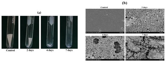 Biodegradation of PHB progresses with changes in its physical properties, such as surface morphology, molecular weight, and functional groups. As PHB depolymerases work extracellularly from adhesion to the surface of the PHB, it is necessary to observe surface erosion and changes, which is one of the most noticeable changes throughout biodegradation [,,]. Because Microbulbifer sp. SOL66 showed great biodegradation activity, it was cultivated with 100 mg of PHB pellets at 37 °C for 18 d to observe surface changes throughout biodegradation. The weight of the pellets did not decrease; however, surface changes in the pellets were detected after 18 d. The PHB pellets were collected, washed, and then coated with gold. The surface changes were observed using SEM and ultra-high resolution field emission scanning electron microscopy (Figure S1). Compared to the intact PHB pellet, which showed a smooth and even surface, the degraded PHB pellet showed erosion on a rough surface with pores. To obtain dramatically degraded samples, the PHB pellets were transformed into films using the solvent-cast method and cultivated with the cell. Microbulbifer sp. SOL66 cells were cultured in liquid MB medium with a PHB film at 37 °C for 7 d, and the residual PHB films were collected (Figure 3a). The amount of residual PHB films gradually decreased, resulting in the cleavage of the PHB film into several pieces after 4 d of cultivation. Finally, only a small amount of degraded PHB particles was collected after 7 d of cultivation. To obtain detailed images of the degraded films, the collected PHB films were washed with distilled water to remove cell residue and coated with gold to prevent edge effects and to obtain clear images using SEM. The samples were observed at 1000× magnification, which was suitable for observing surface changes (Figure 3b). Compared to the control, which showed a smooth surface, the degraded PHB films showed a rough and porous surface. It seemed that surface erosion was ongoing in the first 2 d, showing a partially rough surface, and after 4 d of cultivation, the whole surface became uneven, and large pores formed. On the final day, large cracks appeared on the surface, leaving the entire film destroyed.