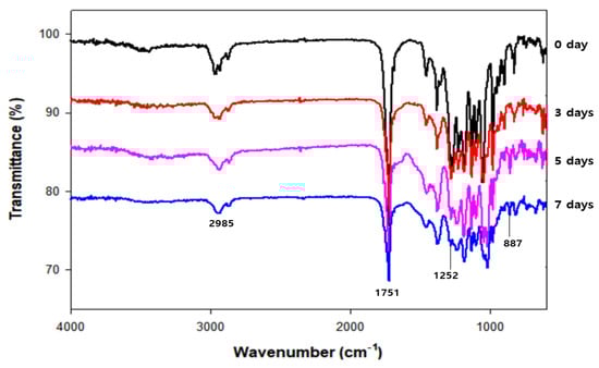 In addition to the surface morphology, the functional groups in the degraded PHB film were analyzed using FTIR (Figure 4). Changes in several peaks were detected compared with the intact PHB film. For instance, the peak at 2985 cm−1 showed differences in the degraded PHB films, indicating that the C–H stretching bond had some changes throughout biodegradation. Likewise, the intensity of peaks at wavenumbers of 1252 cm−1 and 887 cm−1 considerably decreased during biodegradation, representing C–O stretching and C–H bending bonds, respectively []. In particular, the intensity of the peak at 1751 cm−1 showed a significant reduction, indicating that the C=O ester bond was affected throughout biodegradation. This phenomenon might be attributed to the cleavage of PHB, which is a polymer that is connected by the ester bonds of its monomers. From the FTIR data, it was observed that the PHB film was affected by Microbulbifer sp. SOL66 during cultivation.