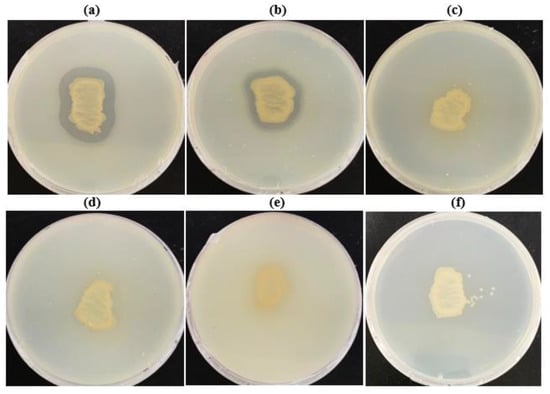 Biodegradation activity of the Microbulbifer sp. SOL66 cells were applied to other bioplastics. (a) Poly(3-hydroxybutyrate-co-4-hydroxybutyrate) [(P(3HB)-co-4HB)], (b) poly(3-hydroxybutyrate-co-3-hydroxyvalerate) [P(3HB-HV)], (c) polybutylene succinate (PBS), (d) polybutylene adipate terephthalate (PBAT), (e) polycaprolactone (PCL), (f) polylactic acid (PLA). The cell was cultured on the plates containing bioplastic emulsion, and the formation of the clear zone was observed.
