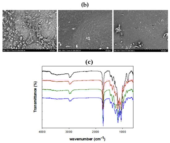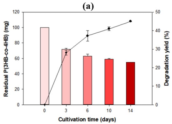 For detailed data, Microbulbifer sp. SOL66 was cultivated with the P(3HB-co-4HB) resin and further experiments were performed. Because the resin was a highly viscous substance, it was challenging to make a film of it. Thus, Microbulbifer sp. SOL66 was cultivated in liquid MB medium with 100 mg of P(3HB-co-4HB) resin. The residual resin was collected and washed, followed by lyophilization, and the weight loss was measured gravimetrically (Figure 6a). The results showed a significant decrease in weight in 14 d. During the first 3 d, a rapid decrease, representing approximately 30% of weight loss, and a gradual decrease, reaching approximately 45% of weight loss, was observed in 14 d. In addition to weight loss, the surface morphology was observed using SEM (Figure 6b). Compared to the intact PHB, the P(3HB-co-4HB) resin showed a significantly different surface owing to its high viscosity. The intact resin showed a smooth and glossy surface; however, after a few days of cultivation, it showed a rough surface with a small crack on it. Unlike the surface of the PHB, distinct differences were not detected on the surface of the P(3HB-co-4HB), which seemed to be due to its high viscosity, which prevented an attack by the microbial strains []. Changes in the functional groups were also analyzed (Figure 6c), with peaks appearing at 2983 cm−1 (C–H stretching), 1733 cm−1 (C=O stretching), 1167 cm−1 (C–O stretching), 1053 cm−1 (C–O stretching), and 801 cm−1 (C–H bending). In particular, the intensity of the peaks at 801 cm−1, 1053 cm−1, and 1167 cm−1 considerably decreased, compared to the Fourier transform infrared spectroscopy data of the PHB film, indicating that ester and aliphatic ether bonds were mainly affected by the biodegradation activity of the cell.
