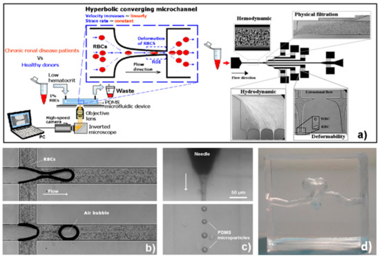 PDMS applications: (a) in microfluidic devices to assess motions and deformations of red blood cells (RBCs) from healthy donors and pathological patients [36]; (b) in microchannel networks to investigate gas embolism [38]; (c) with a flow-focusing technique to generate micro-sized PDMS particles [44]; (d) with PDMS biomodels to assess the blood flow behavior in aneurisms [39].