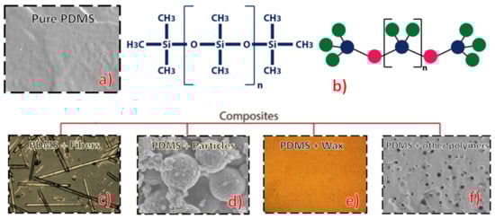 Therefore, the combination of PDMS with other materials allows the optimization and expansion of its applications and has already been extensively explored. The next topics discuss some of the main composites of the PDMS matrix, dividing them into materials filled with fibers or particles, and materials in which there is a combination of waxes (Figure 2e), polymers (Figure 2f), or another additive.