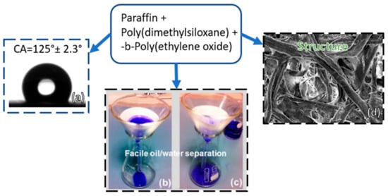 Another interesting coating using PDMS combined with paraffin wax is found in the textile engineering field, where it is manufactured using a simple inlaying process. The prepared textiles exhibited stability after mechanical abrasion and chemical corrosion. Furthermore, the coated textiles have excellent self-cleaning and water repellence abilities and can be used to separate various types of liquid mixtures such as oil–water, diesel oil, and crude oil. The separation efficiency can reach up to 95% in the separation of the diesel oil–water mixture specifically [110]. A new method of modifying the surface properties of filter papers, making them super hydrophilic and super oleophobic underwater in a simple and economical way, was presented in Figure 4. Both super hydrophilic and super oleophobic paper can reach up to 99% efficiency for gravity oil–water separation [111].