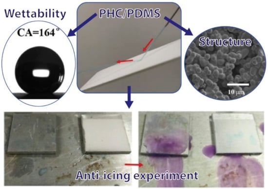 - Hong, S.; Wang, R.; Huang, X.; Liu, H. Facile one-step fabrication of PHC/PDMS anti-icing coatings with mechanical properties and good durability. Prog. Org. Coat. 2019, 135, 263–269. [Google Scholar] [CrossRef]