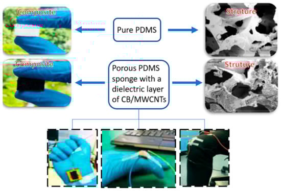 - Hwang, J.; Kim, Y.; Yang, H.; Oh, J.H. Fabrication of hierarchically porous structured PDMS composites and their application as a flexible capacitive pressure sensor. Compos. Part B Eng. 2021, 211, 108607. [Google Scholar] [CrossRef]