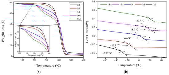 In Figure 3 are depicted the TGA and the DSC traces for the different hydrogels, and in Table 3 are summarized the most relevant results obtained from the TGA and DSC curves. From TGA data, it is possible to determine the weight loss at different temperatures (260 °C, 340 °C, and 460 °C). At 260 °C is shown a slight weight loss increase from 0.8% to 14.0% and at 340 °C from 6.0% to 27.2% when the amount of AAc is increased in the mixture from 0 to 15 mole (0:1 to 15:1). Similarly, it is possible to observe a residual mass increase from 3.3% to 9.1% at 460 °C. These results show that the thermal stability of the compound slightly decreases with the AAc inclusion, leaving a more significant residual mass at high temperatures. Jeong et al. [] obtained similar results using polyAAc hydrogels, which contain different metronidazole concentrations. According to the obtained thermograms, three main steps of thermal decomposition are shown: the first one is related to the evaporation of adsorbed water (weight loss about 0.2–2.7%); the second could be attributed to the destruction of polyAAc lateral groups, leading to decarboxylation or anhydride formation (weight loss of ~2.6–11.9% between 200 °C and 300 °C); and the third step is associated to main chain scission and composite depolymerization above 300 °C.