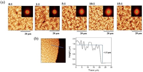 The successive vacuum and UV irradiation steps lead to wrinkled hydrogel films with variable wrinkle characteristics (wavelength and amplitude). In addition to the preliminary visualization of the wrinkle formation by optical microscopy (Figure S3, Supplementary Material), AFM microscopy was used to obtain more accurate information. Figure 4a shows a set of AFM images for the samples at different mole ratios (from 0:1 to 15:1). Additionally, the top right corner inset represents the two-dimensional Fast Fourier Transform (2D-FFT) of the respective AFM micrographs. Information about the wavelength, amplitude, roughness, area increase percentage, and aspect ratio (wrinkle height/width) can be obtained by analyzing these images. Finally, the samples’ thicknesses can also be determined by measuring the border’s depth profile (see Figure 4b). For all the examples, the film thicknesses were found in the range of 1.5–1.7 μm, thus indicating that the spin-coating technique generates homogenous films with similar thicknesses independently of the sample composition used in each case, as expected. These results were later corroborated via ellipsometric techniques.