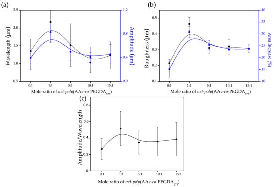 Morphological characteristics obtained from AFM analysis. (a) Wrinkle wavelength and amplitude, (b) roughness and area increase, and (c) aspect ratio of the hydrogel films of net-poly(AAc-co-PEGDA575) at a different mole ratio (0:1, 1:1, 5:1, 10:1, and 15:1).