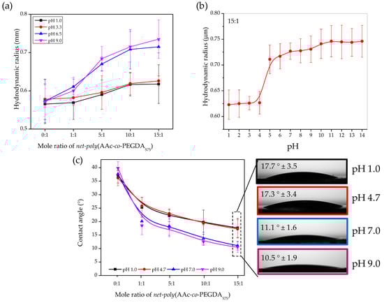 (a) Dependence of the hydrodynamic radius at four different pHs (1.0, 3.3, 6.5, and 9.0) for the samples poly(AAc-co-PEGDA575), (b) DLS-Titration curve of the for the sample 15:1 using several pHs as analysis medium, and (c) contact angle of a small drop on the hydrogel surface with different pH, together with some representative images.