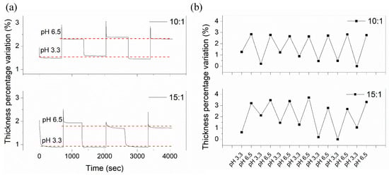 In our case, two buffers based on citric acid and sodium hydroxide with pH 3.3 and 6.5 were used to test the copolymer’s pH response. A small drop of the reaction mixture dissolved in methanol (200 μL of the mixture in 4 mL of dissolvent) was deposited on the quartz sensor and irradiated with UV light for their polymerization. The drop was allowed to evaporate at ambient conditions for few minutes, and the frequency measurement was carried out. Then, the process was repeated using a different buffer. Figure 7a shows the time dependence vs. thickness percentage variation of the samples (10:1 and 15:1) with three pH cycles. Thus, when the pH is increased from 3.3. to 6.5, the carboxylic groups become ionized, the AAc chains are expected to stretch, and the brush becomes thicker and increasingly hydrated, thus increasing its mass density and probably increasing its thickness. The QCM response was reversible and fast (less than five minutes) when the pH was decreased from 6.5 to 3.3, reaching a similar value as the measured initially. The percentage thickness difference is almost the same for the two concentrations of AAc analyzed (10:1 and 15:1), similar to the hydrodynamic radius results obtained from the DLS analysis. The compounds that present lower concentrations of AAc, like 1:1 or 5:1, do not show any significant thickness variation.