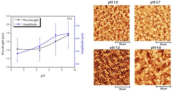 Finally, the pH response has not only an effect on the film thickness but also on the wrinkle characteristics, i.e., wavelength and amplitude. As depicted in Figure 8, both amplitude and wavelength increased with the pH. The changes observed are reversible upon changing the environmental pH. Interestingly, this system based on acrylic acid complements previous works in which the use of diethylaminoethyl methacrylate (DEAEMA) (thermal-pH responsive) allowed the preparation of wrinkles with lower wavelength and amplitude upon increasing the pH []. It is interesting to note that, in those previous works, the wavelength of the wrinkles formed remains clearly above 5 μm, while with this current approach, the wavelength has been significantly reduced to the range of 1.2–1.7 μm.