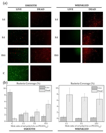 Figure 10a shows live (green) and dead (red) S. aureus bacteria over films (wrinkled, smooth, and control (C)). The samples designated as control (C) correspond to a planar surface formed exclusively by PEGDA575, i.e., without acrylic acid. Over smooth control surface, viable bacteria colonies were observed. However, the presence of acrylic acid induces the apparition of red-colored bacteria, i.e., dead bacteria. Interestingly, when the acrylic acid content increases on smooth surfaces, the number of dead bacteria becomes higher, evidencing the antimicrobial behavior of this surface functionalization.