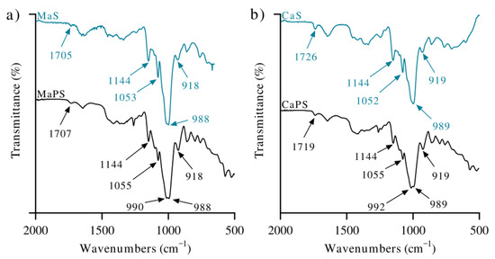Figure 1a,b illustrate the FTIR spectra of MaS and MaPS and CaS and CaPS, respectively. Absorption bands in the range of 992–1200 cm−1 in starches were associated with interactions between starch molecules and the plasticizers [30]. The spectra of CaPS and MaPS showed the presence of a new peak at 992 and 990 cm−1, respectively; while the absorption of C–C–O of the anhydroglucosidic ring showed no change (988 cm−1), which appeared in the unplasticized starches MaS and CaS [31]. Interestingly, there was no displacement of the band at 988 cm−1 of C–C–O, but there was the formation of a new absorption, which Zullo et al. identified at approximately 1015 cm−1 [31], which suggests a new interaction as well as new modes of vibration after starch thermoplasticization.