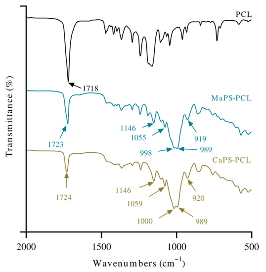 The shift in the carbonyl absorption was slightly more evident in CaPS–PCL, from 1718 to 1724 cm−1 (Figure 2), quite possibly because CaS contains more amylopectin than MaS. The functional groups that form hydrogen bonds may be more available in CaS as reported in the literature [8]. It has also been reported that in esters, the absorption of the carbonyl group presents a shift in the infrared absorption frequency when the group is associated [27].