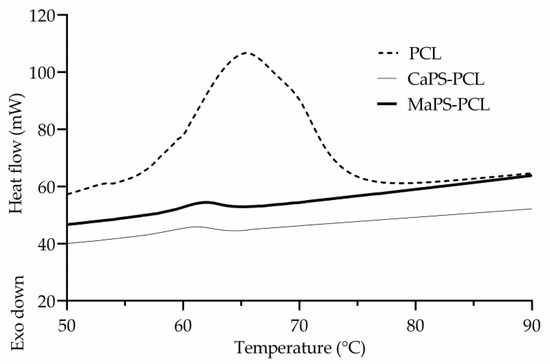 DSC thermograms of PCL, CaPS–PCL, and MaPS–PCL.