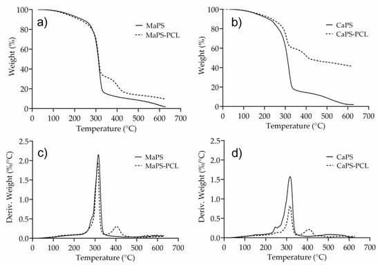 TGA traces of (a) MaPS and MaPS–PCL and (b) CaPS and CaPS–PCL. DTG traces of (c) MaPS and MaPS–PCL and (d) CaPS and CaPS–PCL.