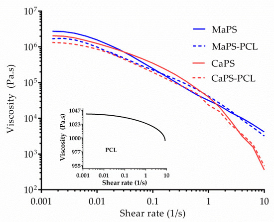 Figure 5 shows the effect of the incorporation of PCL on the viscosity of the blends with corn and cassava starch. As seen, PCL had a plasticizing action, since at a zero shear rate, MaPS and CaPS had a higher viscosity than the MaPS–PCL and CaPS–PCL blends.