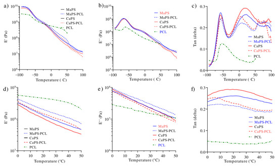 Figure 6a shows the storage modulus (E’) of the blends in a wide range of temperatures in which similar performances were observed for all of the blends. However, in the temperature range of 20–40 °C, which is where the majority of practical applications occur (Figure 6d), the MaPS–PCL and CaPS–PCL blends were the ones with the highest rigidity, below the PCL, which decreased as the temperature increased. According to this, above 40 °C, the material would not be functional for applications that require a polymer with greater rigidity.