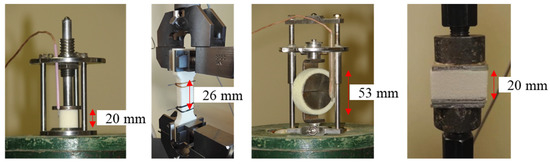 Compressive strength in 10% of deformation was measured using Zwick Z010 TN (Zwick GmbH & Co, Ulm, Germany) for foams at a temperature of 293 K. The tests were performed in two directions—parallel (Z) and perpendicular (X) to foam growth—and cylinders of 20 mm diameter and 20 mm height were used as samples. For the compression test in cryogenic (77 K) temperatures, similar samples as for testing at 293 K were used together with a testing jig that can be submerged into a liquid nitrogen container. The tensile properties were determined by testing two different shape samples. For tensile tests at a temperature of 293 K, dumbbell-shaped samples (length 153 mm, thickness 12 mm, width 440 mm and bottleneck 26 mm) were used, whereas for tensile tests at a temperature of 77 K, ring-type samples were used (width 13 mm, inner diameter 43 mm and outer diameter 53 mm). The tensile measurement was performed only in a parallel direction using Zwick Z010 TN (Zwick GmbH & Co, Ulm, Germany) due to a rigid PUR foam sample block height limitation. The different mechanical properties of the testing jigs are depicted in Figure 1. To test compression and tensile properties at cryogenic temperatures, the samples, together with the testing jig, were submerged into liquid nitrogen. It can be easily performed for the small cylindrical-shaped samples for the compression strength test. Unfortunately, it was not feasible to submerge into liquid nitrogen the relatively large dumbbell-shaped samples together with the cumbersome clamps. Thus, a different sample size was used, i.e., rigid PUR foam rings, which were pulled apart by steel half-cylinders (Figure 1.) For all tests at liquid nitrogen temperatures, the sample was conditioned in liquid nitrogen for 5 min before testing. Detailed analysis of this method has been described in [30]. For each rigid PUR foam formulation, a minimum of five replicates of the mechanical tests were performed. Moreover, for the tensile strength tests at a temperature of 77 K, eight replicate samples were tested.