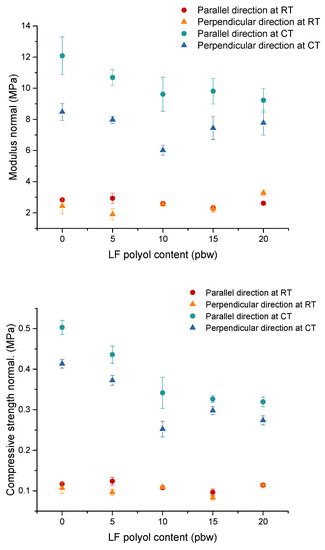 The mechanical strength of rigid PUR foams depends on many factors, including the type of raw materials used, the apparent density of the material, and its cellular structure, which is formed during the foaming process [42]. The results clearly indicate that the values of compressive strength and compressive modulus for rigid PUR foams were lower at RT than CT. For CT temperatures, the compressive strength values ranged from 0.25 to 0.50 MPa, while for RT temperatures, the values were about 0.1 MPa. The higher values obtained for mechanical tests at cryogenic temperatures were due to the higher stiffness of rigid PUR foams at lower temperatures. Moreover, in both cases, it was observed that the values obtained for the tested systems in the direction parallel to the direction of foam growth were higher than in the perpendicular direction. The differences in the values in different directions were due to the anisotropic structure of the foams, which were confirmed by the anisotropy coefficient (Table 4). It is worth noting that the parameter tested under different temperature conditions indicates that these materials have a good compressive strength of over 0.1 MPa. In the case of the rigid PUR foams with the highest content of LF polyol, the highest difference in compressive strength and modulus were noticed when comparing the results in parallel and perpendicular directions to the foam growth direction. This foam also had the highest anisotropy coefficient and average cell area in both foam cross-sections. Increasing the LF polyol content in the PUR system resulted in a decrease in compressive strength and compressive modulus at both RT and CT. Replacement of short DEG chains with an LF polyol containing long, dangling chains derived from hydrocarbon residues of higher fatty acids resulted in a plasticising effect. A similar effect was observed in other studies when bio-polyols that contain dangling chains were applied [8,43].