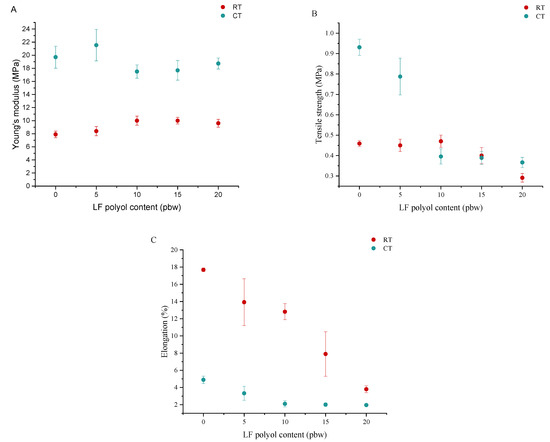 Tensile modulus (Young’s) (A), tensile strength (B) and elongation at break (C) of foams at RT and CT.