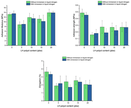 The results showed that the introduction of LF polyol into the PUR system resulted in a decrease in the adhesion strength values compared with the system without this bio-polyol. The results obtained are higher than 0.1 MPa, which for foam materials is a favourable value at low-temperature applications. Moreover, the results clearly indicated that the cryo-shocked samples obtained similar values of adhesion modulus strength and elongation at break. These materials can be successfully used as insulation in space, where the temperature is close to the temperature of liquid nitrogen.